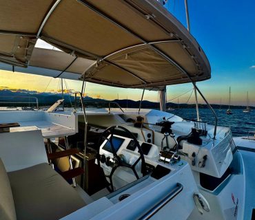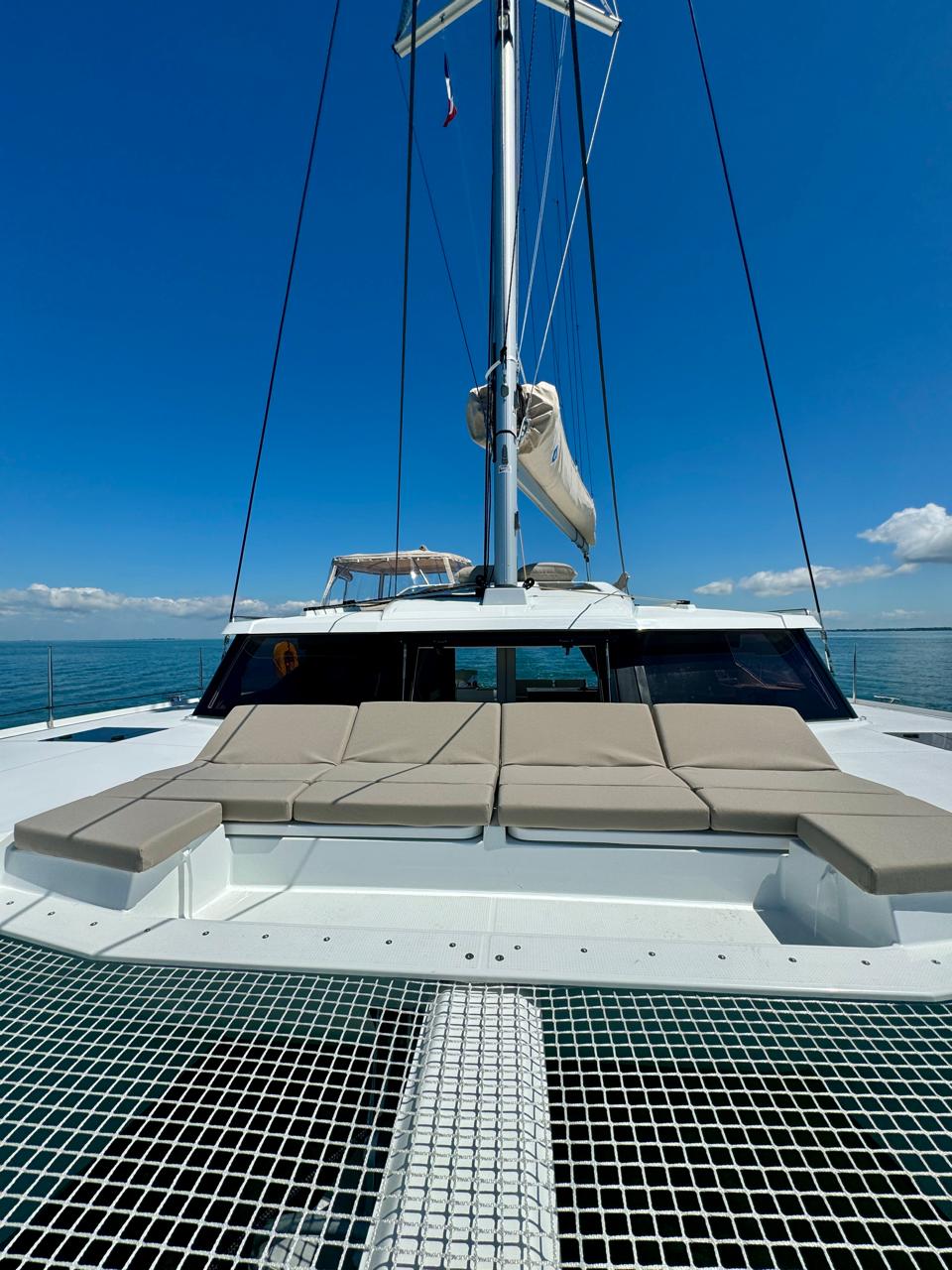 This award winning 45 foot catamaran boasts energetic lines and inverted bows, accommodating incredible interior and exterior living spaces which make a her truly exceptional multihull. An extensive cockpit opening onto an innovative saloon, together with the largest lounge space of her category, and lots of invisible storage are complemented by generous relaxation spaces on the foredeck and lounge deck (flybridge), not to mention the convenient electric aft swim/tender platform (150 kg).