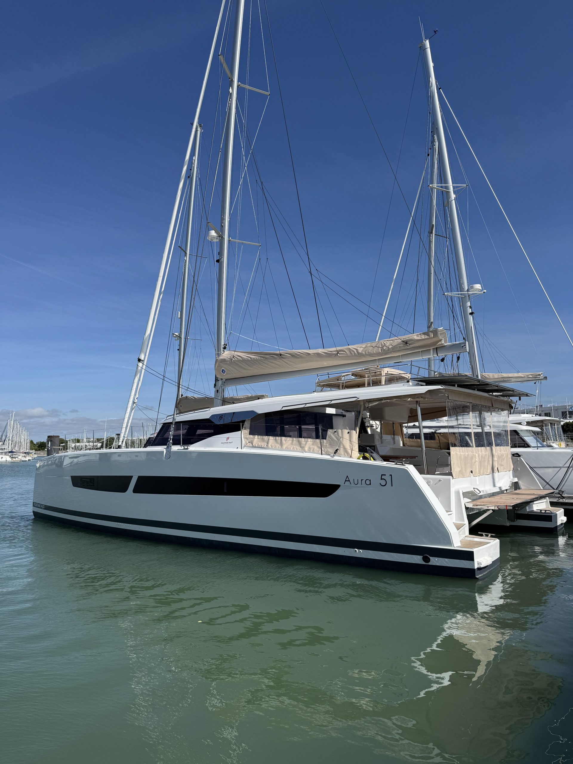 The Fountaine Pajot AURA 51 was specifically designed to merge luxury living with blue-water performance. It stands out for its expansive exterior layout and a flush-deck design with fully opening sliding doors that seamlessly connect the saloon and the cockpit . The galley is positioned at the heart of living space, featuring a central island that provides a contemporary feel and a sociable gathering point. Outside, the Aura 51 has a flybridge that offers a massive lounge and sunbathing area separate from the mid height helm station, plus a comfortable forward cockpit.